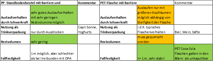 Eine Fallfestigkeit im Bereich von 1 m ist für den Standbodenbeutel aus Polyolefinen möglich, aber schlechter als bei bisherigen gemischten Verbunden mit oPA und auch schlechter als bei der PET-Flasche.
