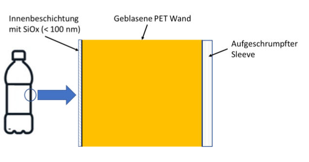 Bild 1.2: Wandaufbau einer PET-Flasche mit Innenbeschichtung z.B. aus SiOx und aufgeschrumpften Sleeve